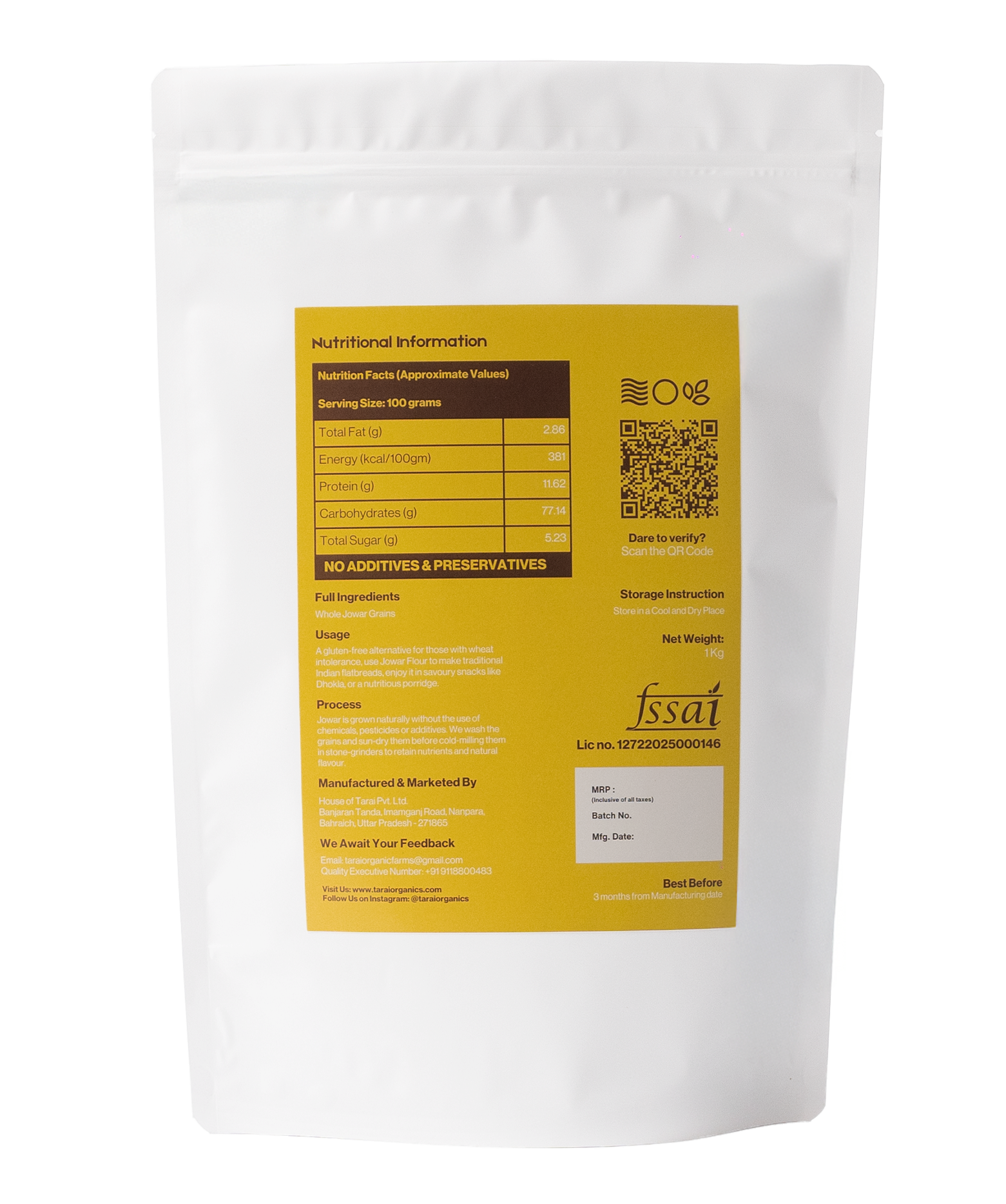 Jowar flour, also known as Sorghum Flour, is a gluten-free and nutrient-rich flour made from whole sorghum grains. It is a popular choice in Indian and global cuisines for its versatility and health benefits.